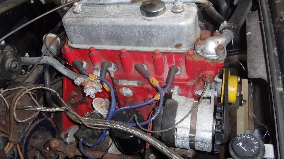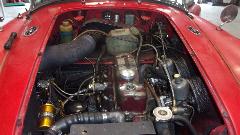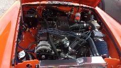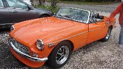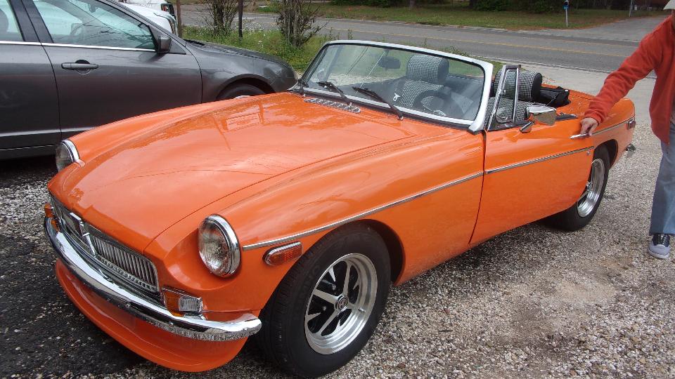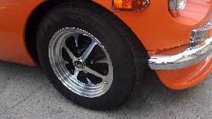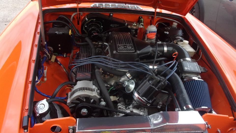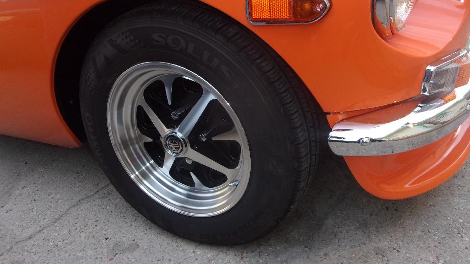 The orange MGB was a bit of a special with a Rover 3.9L aluminum V8, modern version with computer control and electronic fuel injection. Someone had to point out that the wheels which look like common MGB 14" RO-Style are actually 15" aluminum wheels from a modern Ford Mustang. Sweet.