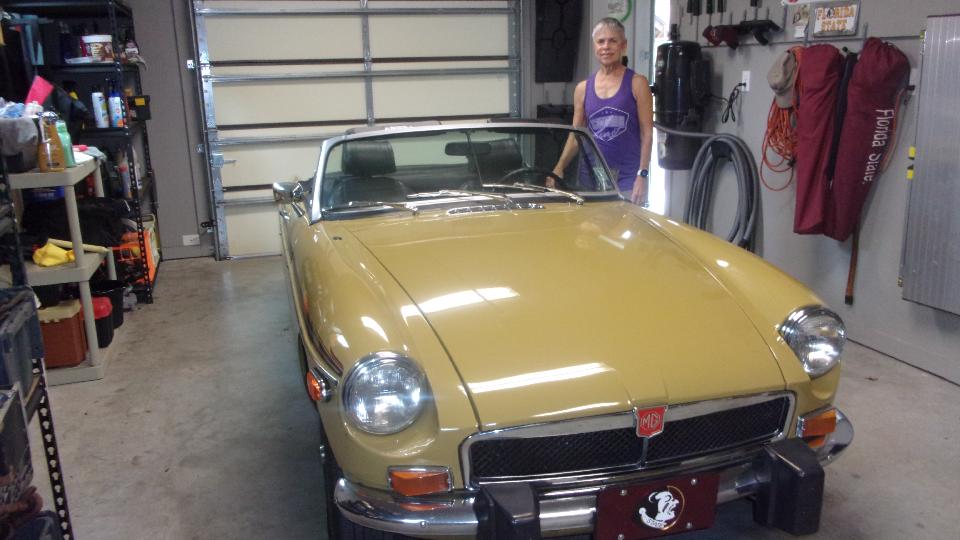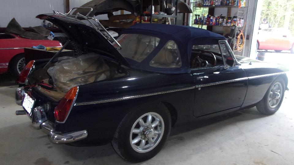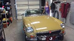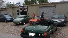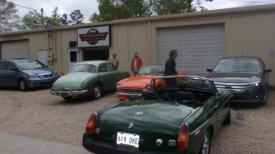 Off to visit Jimmy Watts and his wife in Lacombe, Louisiana. The nice 1974-/2 MGB belongs to her, and she loves that car. She also likes the Sabrina overriders unique to the half year, part of the character of the car. But we weren't here for the social visit. We came to borrow the garage, and the lift, to go after replacing piston rings in our MGA, so this was destined to be a "get your hands dirty" work day.