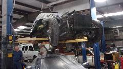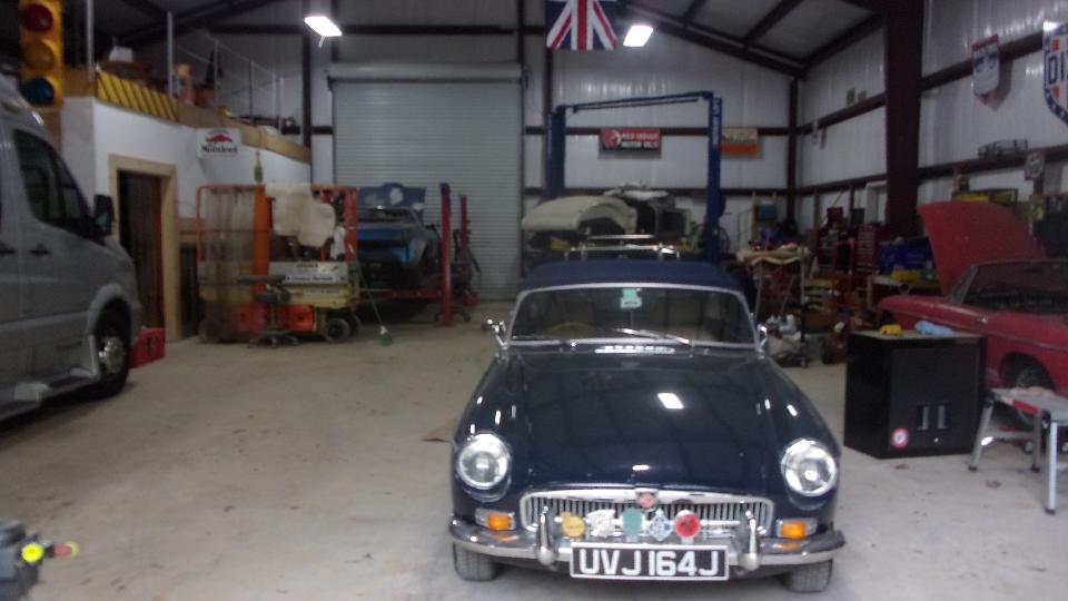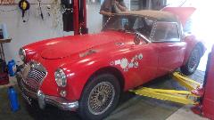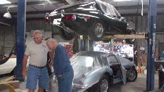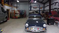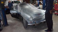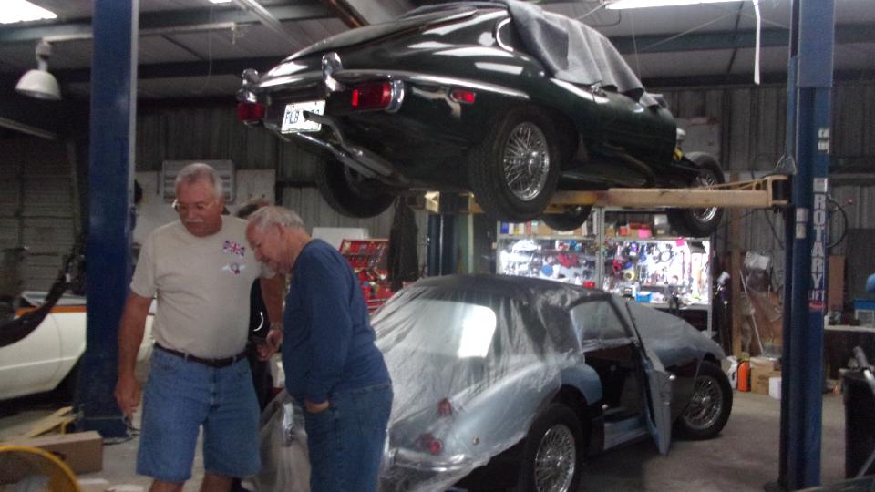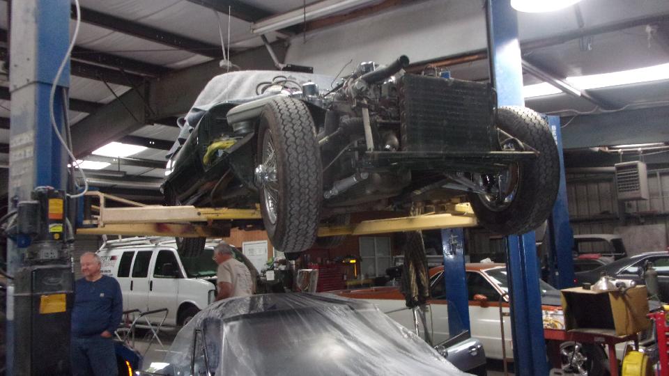 Jaguar E-Type Coupe on the lift, and Austin Healey 3000 underneath, both coming along nicely. All mechanical work being done here, with body and paint work farmed out to a nearby shop (for now), so one-stop shopping for full restoration. With his new shop (soon) Hugh intends to be doing all restoration work in house.