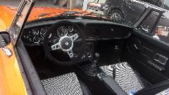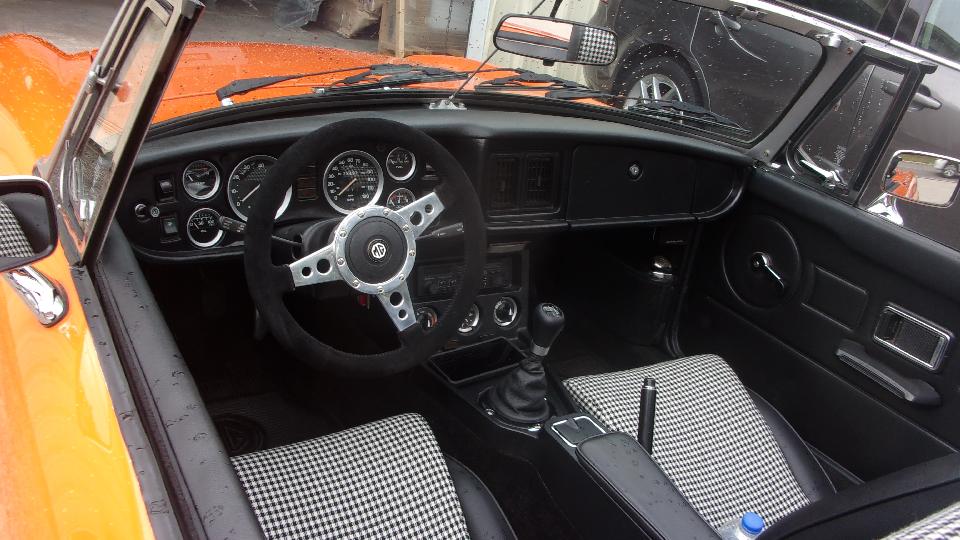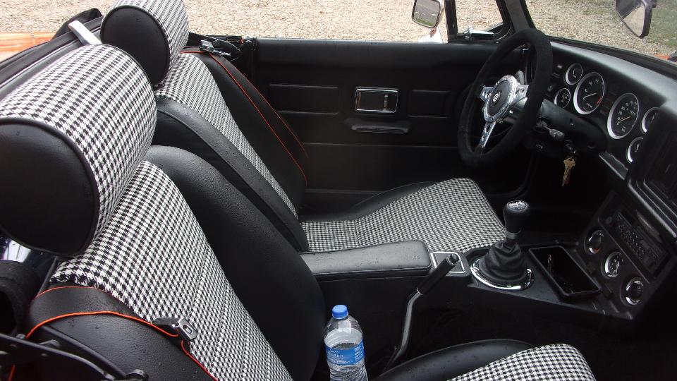 Same orange MGB (V8) we saw at the cafe. The owner took his time searching for just the right seats. These houndstooth seats are from a modern Mini Cooper. Really? Who'da thunk? Good thigh support, lumbar support, side bolsters and headrest, and good quality durable materials.