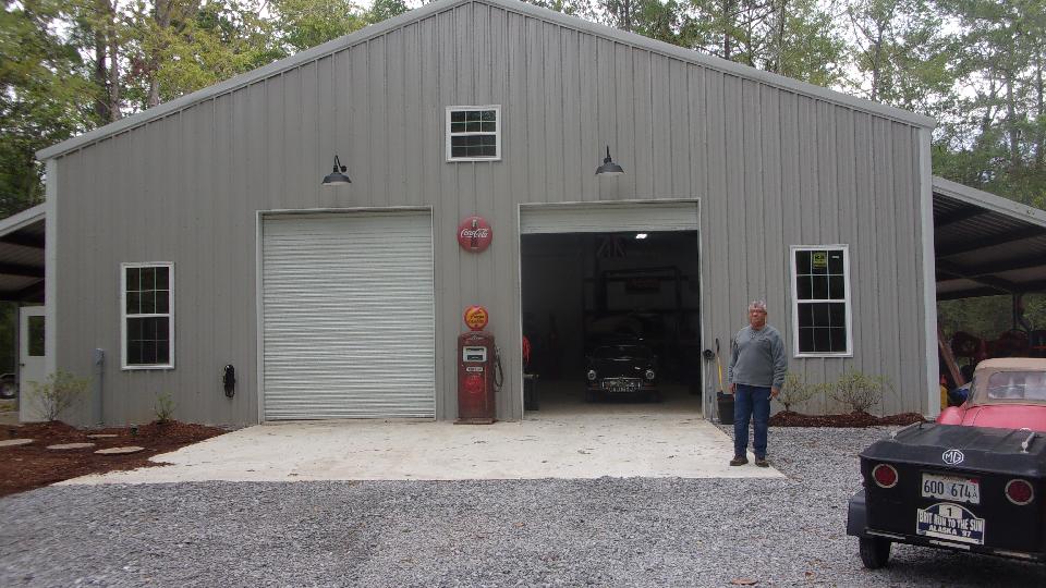 Not done yet. Off to visit Charles (Charlie) Foy in Covington, LA. The little "shed" here is his personal toy shop, not commercial, just built within the past two years. Under the left side awning is a nice shady patio for lounging. Behind the left window is a wood shop and a restroom. Under the right side awning is equipment parking with a work tractor (among other things). Inside is a huge hall, even bigger than it looks. Look left beyond and over the motor home van to see second level storage space front to back. I think the room in the rear corner is engine (mechanical) shop space.