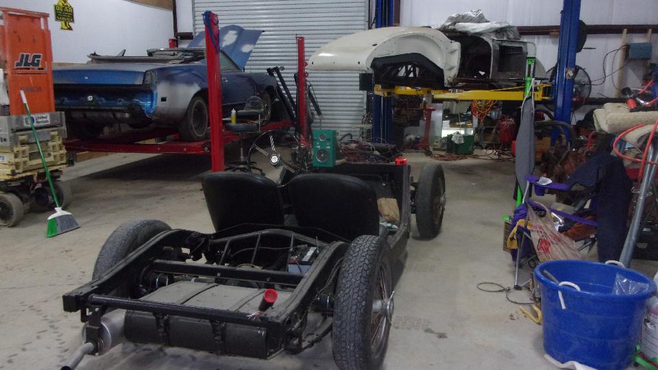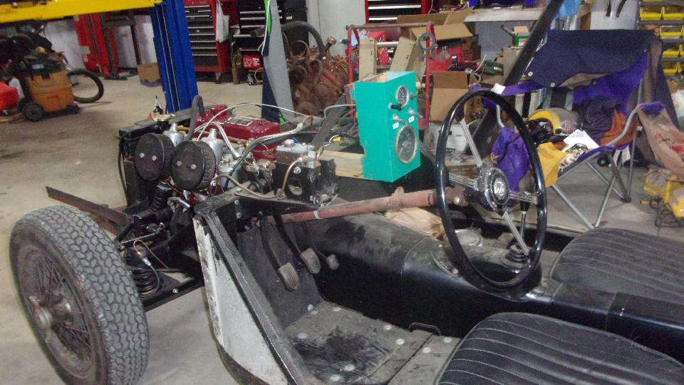 Two lifts, a drive on lift in the center bay and a frame hoist on the right. The blue car on the platform lift is an early 70's Mercury Cougar (upgrade sister model to a Mustang). On the frame hoist is Charlie's MGA under restoration. Don't miss the rolling chassis configured in go-kart mode, which has seen a few trips on the local side roads. In the front corner is a red MGB, which I didn't ask about, but the blue one is interesting.