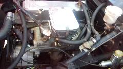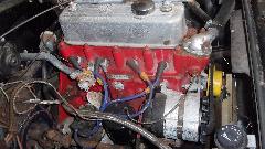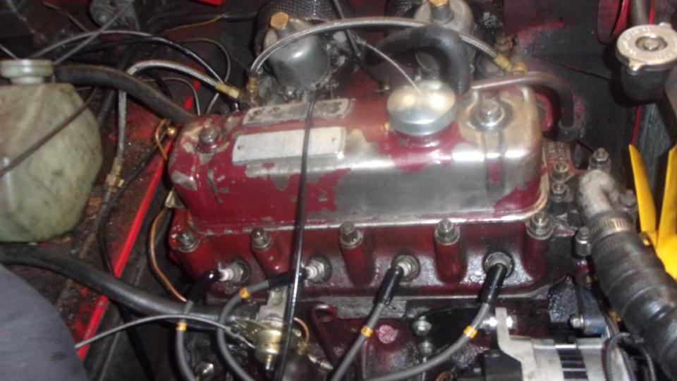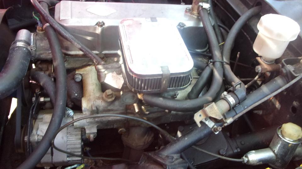 Up top, new oil filter, then the head gasket, head, rocker arm assembly bunch of head nuts and the valve cover. Scratch head once before filling up the oil, remove spark plugs, and crank it 45 seconds to bring up oil pressure. Peachy. Install spark plugs and distributor cap, reconnect temperature sensor, manifold bolts, carburetors, radiator and hoses, top up coolant. Check underneath, find a little drip, tighten one hose clamp, do coolant system pressure test just for good measure. Scratch head twice to assure we hadn't missed anything, shrug shoulders and fire it up.