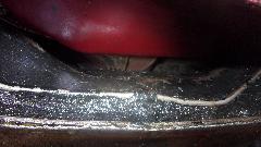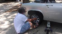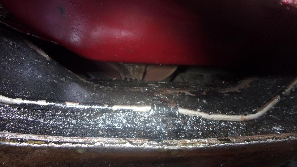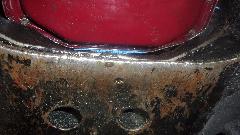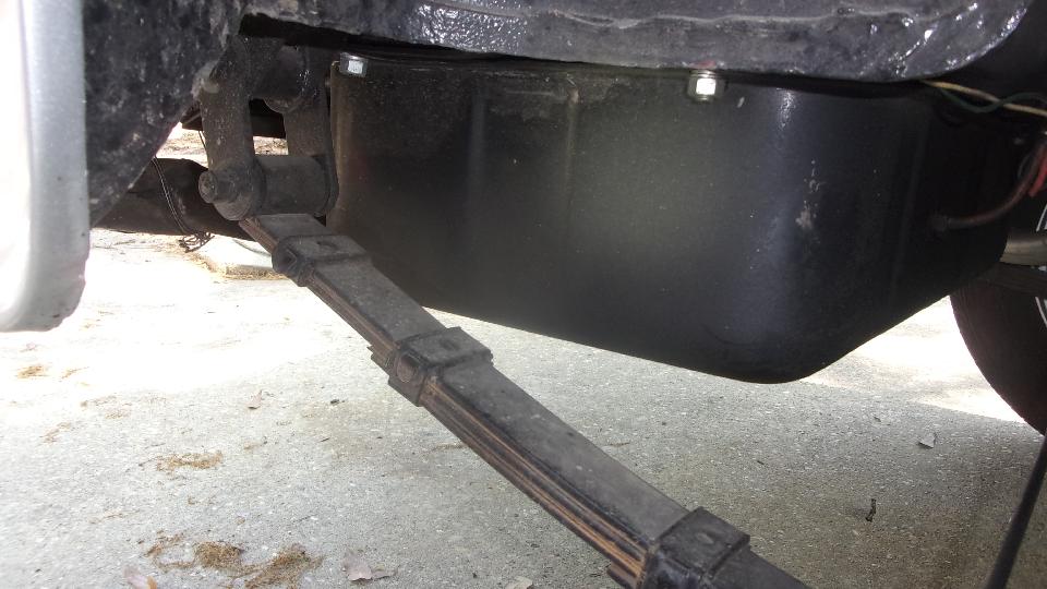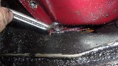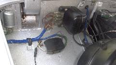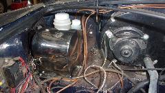 Then take the test light behind the dash, but space is tight, so remove the knurled nut and steel clamp to remove the gauge from dash for easier access to the terminals. Power, ground and signal wires attached, key on, and it jumps off the peg to point at "E", except there is some fuel in the tank. Pull off the signal wire, and the gauge goes hard against the "F" peg, as it should for a magnetic gauge with disconnect or too high resistance. Looks like the signal wire goes from gauge to tank with no intermediate connections, so the fault must be at the sender unit connection, or in the sender unit, in the tank of course. So jack up the right rear and remove the wheel for a look, but the tank is a top flange mount with the sender unit and wire connections on top. Rats. Need to drop the tank for access, so priorities rule, and he decided to live with inoperative fuel gauge, so put it all back together.