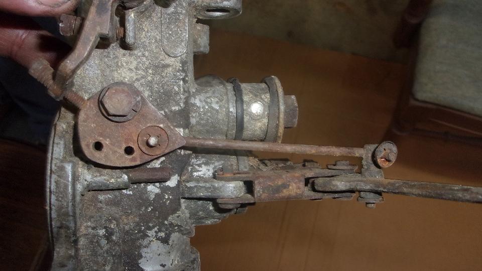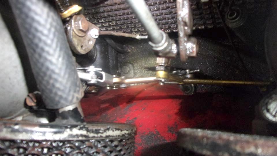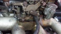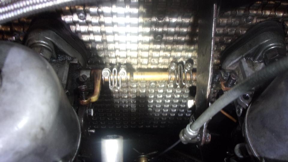 Remove the breather hose up top, disconnect one fuel hose, remove one split pin from the lower choke arm link, loosen the throttle shaft accordion clamp, and two more nuts to get the front carburetor out and on the table. The loose throttle spring turned out to be a badly worn clip hole in the throttle body. Easier to shorten the spring by two coils and re-form the hook end than to weld up and re-drill or to bush the worn hole, so we modified the spring.