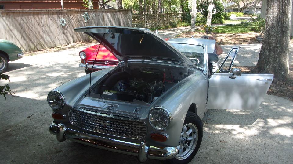 Colin McCormick from Mandeville, LA was up next with his Sunbeam Alpine. This one has a Weber downdraft carburetor conversion, not bad, just not perfect running. Not long to adjust fuel mixture and idle speed, so he was soon off with a smile, along with Benny in his Sprite.