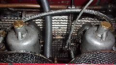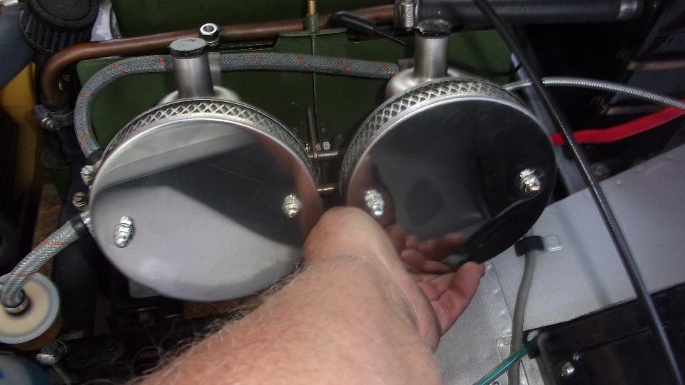 The high torque gear reduction starter spins it right over in spite of being a little tight with fresh honed cylinders and new rings. But fire it does, followed by a nice cloud of white smoke as it burns off all the oil on pistons and cylinder walls. Curious whistle while running, fairly loud, sounds familiar. Give a pull on the rear carburetor and it gets a bit louder. Give a push on the carburetor, and the noise stops. Grab the 9/16" wrench and tighten one nut on top of rear carb, and all is quiet. Big grins all around, put the bonnet back on (6 little thumb screws).
