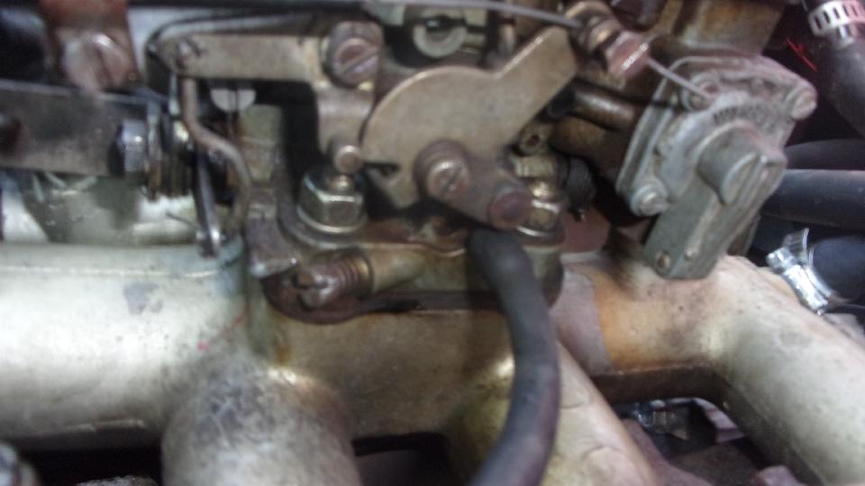 Okay, so there is a leaky intake gasket somewhere, either a carburetor base flange gasket (three for each carburetor with thermal block and heat shield before intake manifold), and/or the manifold to cylinder head gasket. Grab the wrenches and tighten the carburetor mounting bolts and manifold to head bolts, all nice and tight, but the problem persists. Well it runs pretty good, as long as you don't touch the air cleaner. So finish fine tuning and send him on his way with plans to R&R the carbs and manifolds later to replace all the gaskets (and inspect the mechanical parts while it's apart).