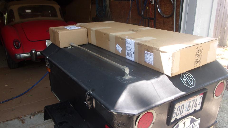 New windscreen glass arrived, so off it Mandeville, LA (storage facility) for pick up, then on to our friend Cliff Hughe's place to get to work. The larger box is the glass and related parts. The smaller one is bits from Moss Motors, everything I ordered Tuesday EXCEPT for the piston rings, which were shipped from west coast Wednesday, so not going to arrive until Monday earliest. But we can do something today. Start by unpacking boxes to check receipts, and file into inventory most things not needed for the windscreen.