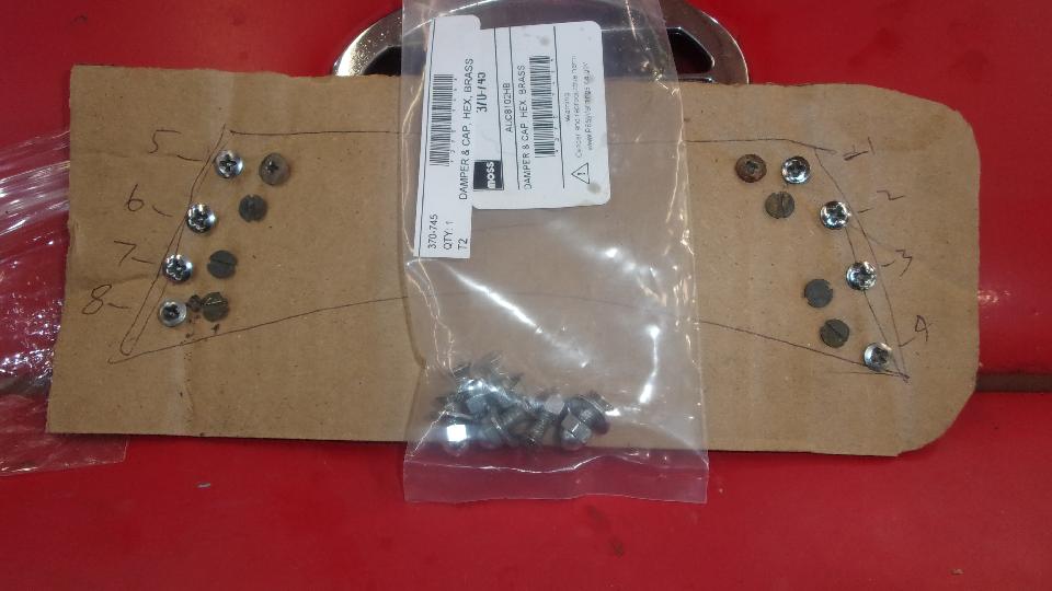 Not to disturb the top and bottom rails or rubber at top or bottom, or any corner brackets attached, only remove four screws from each end securing the side frame rails to the corner brackets. With a little careful prying and good healthy pulling, the 4-piece frame was soon separated, and the cracked glass was off to the dumpster (going to miss the window stickers). The card with simple diagram and punched holes holds the 8 screws removed from the stanchions, and 8-more screws removed form the corner brackets, while the baggie holds six screws with flat washers and acorn nuts removed from grab handles. This actually came apart fairly easy, because it was last disassemble for new glass 3-years 1-month earlier in this same friendly garage (thanks Cliff).