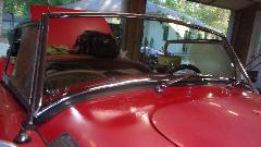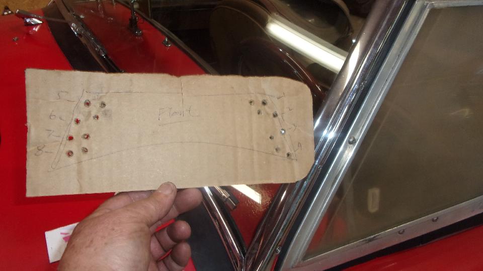 removing the windscreen from the car, on which we took some shortcuts this time. Not to touch the interior kick panels and stanchion bolts, we only removed 4 screws each side to free the windscreen frame from the stanchions, shown stuck in the diagram on the card in that picture to assure they will go back into the same locations when reassembled. Three more screws each to free the frame from the grab handles, and the 4-piece frame and glass assembly was off to the table that easy.