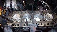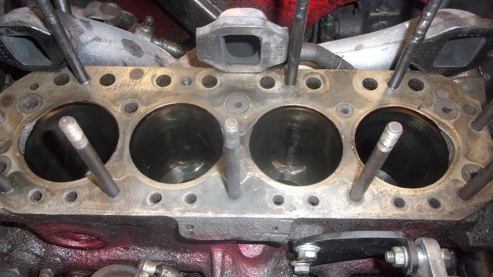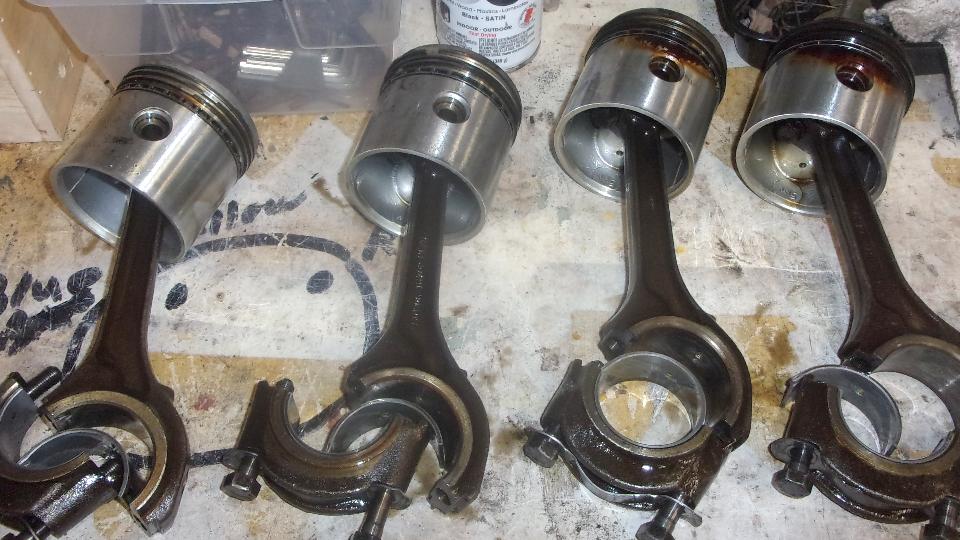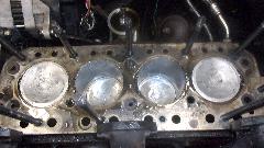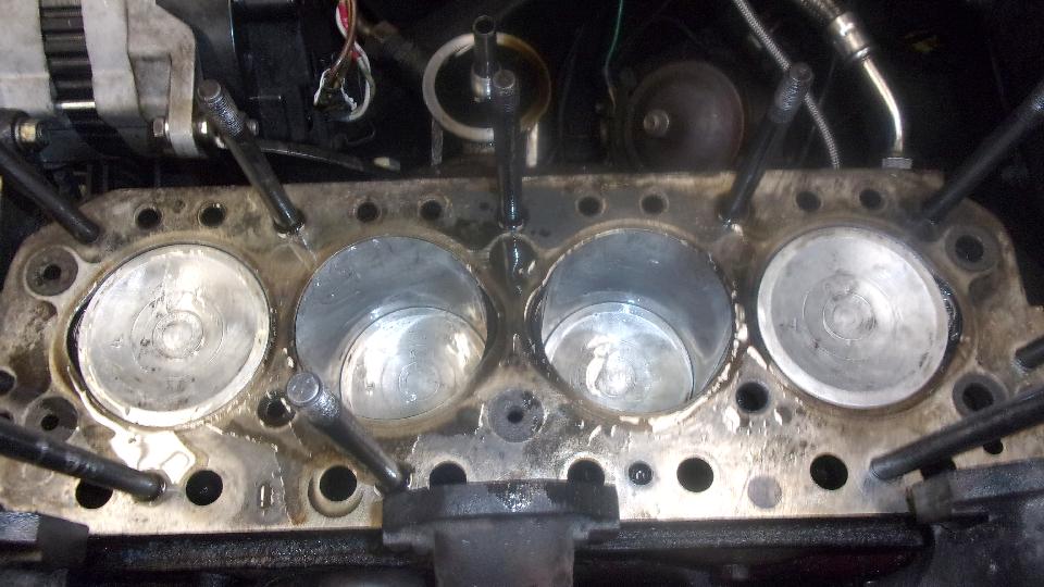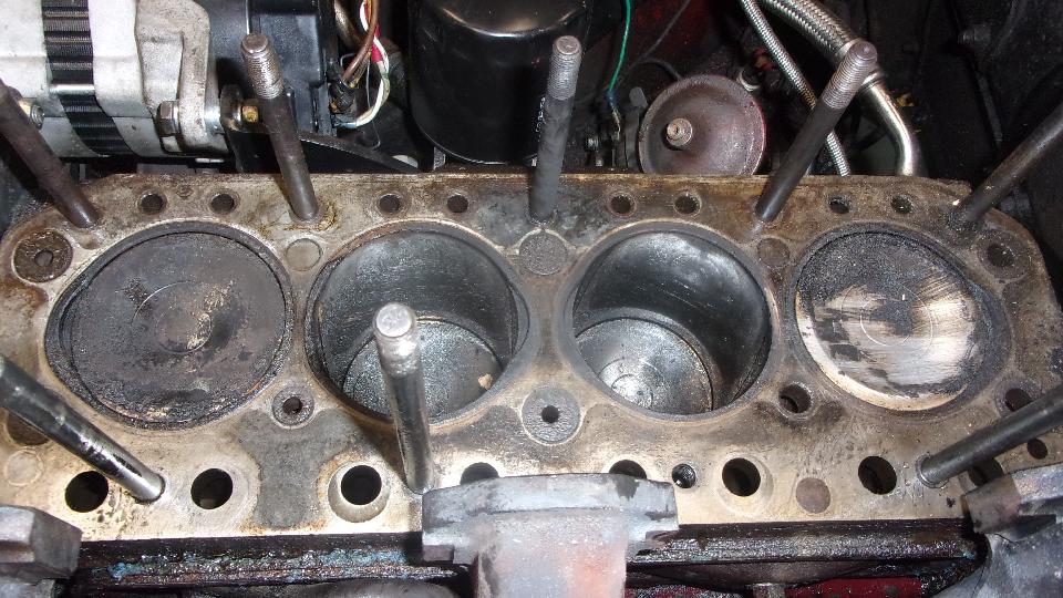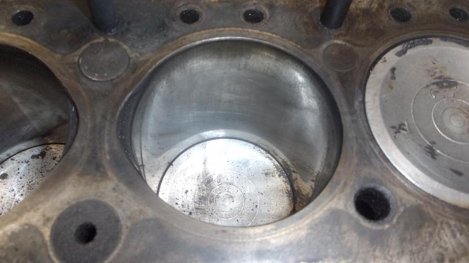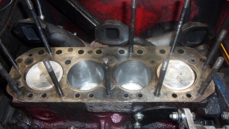 Standard fare to pull the carburetors and cylinder head. Five minutes with a soft wire cup wheel in a power drill to buff a little carbon off the pistons (easier to do in-situ than later with loose pistons). no scratches in the cylinder bores was the first good news.