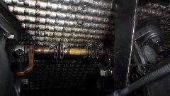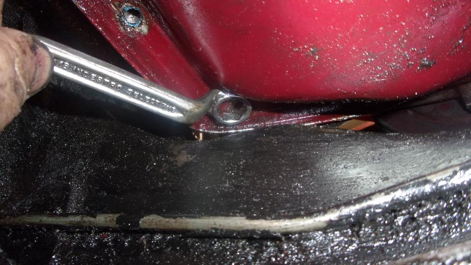 Then looking for any oil leaks. Front end of the sump is dry, and the crank pulley is also dry, so no leaking up front. Rear end of the sump also dry, and no drip from the rear plate or bellhousing. But we did find a leak dripping at the left rear corner of the engine block, 6 or 8 drops per minute (at fast idle speed), which could be quite a significant leak with constant driving. This was from the big acorn nut securing the pressure relief valve, where it is supposed to have two fiber washers (I may have only one there). A good pull on the 1/2" drive ratchet with a socket (maybe 50 lb-ft torque) seems to have stopped that leak, and nothing else found dripping. Big grins by now.