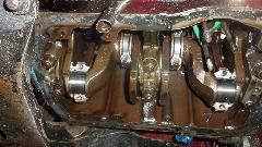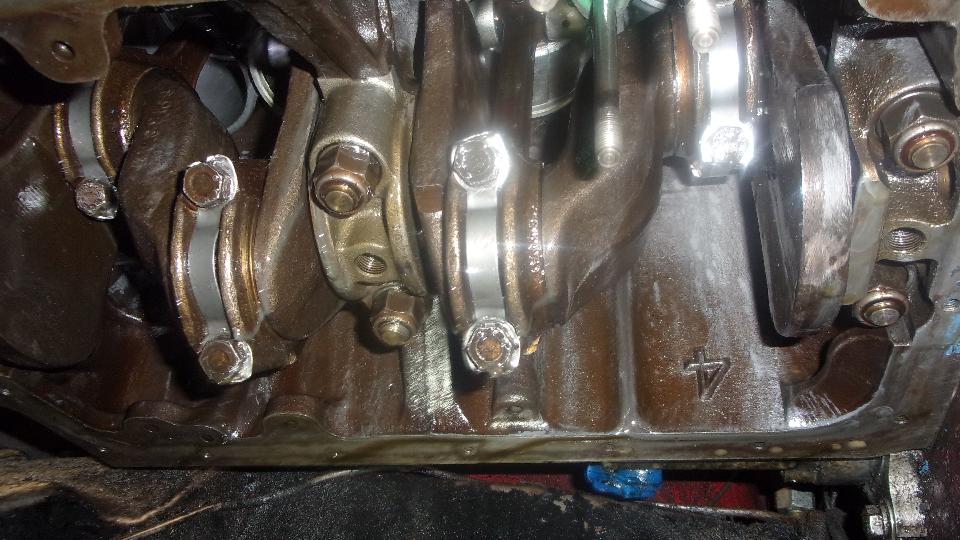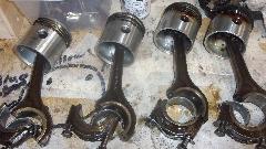 crankshaft, and wash it some more underneath. Cleaned the pistons with carburetor cleaner and a Scotchbrite sponge, and they came out very nice. All new rings on the pistons, lots of oil on everything, and reinstall pistons with rods and big-end caps (reinstalling the 3-year old rod bearings of course). All pretty pretty with freshly honed bores and clean pistons, and then I could stop for a few pictures as we were shutting down for the evening at 7-pm.