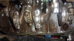 Once the pan is off, just three nuts to remove the oil pump as a matter of convenience. Knock back lock-tabs to remove big end bolts, and push out pistons two at a time. And yes, I am keeping the parts in sequence in matched sets. A quick wipe down for initial inspection shows clean bores, and the pistons are not scuffed, and no broken rings, all good news. The #3 and #4 pistons do show carbon on the sides indicative of compression blow-by, which was pretty much expected along with the low compression readings.