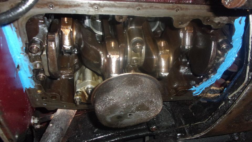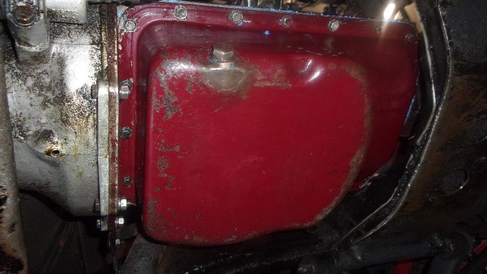 So today would be put it back together day, and we should have plenty of time, get the show kicked off at 10-am. Need to clean stuff up and scrape old gaskets, and be careful about reassembly, so it takes half again longer than disassemblty, but we get there eventually. Bottom side first, oil pump, pan gasket, and 19 little bolts.