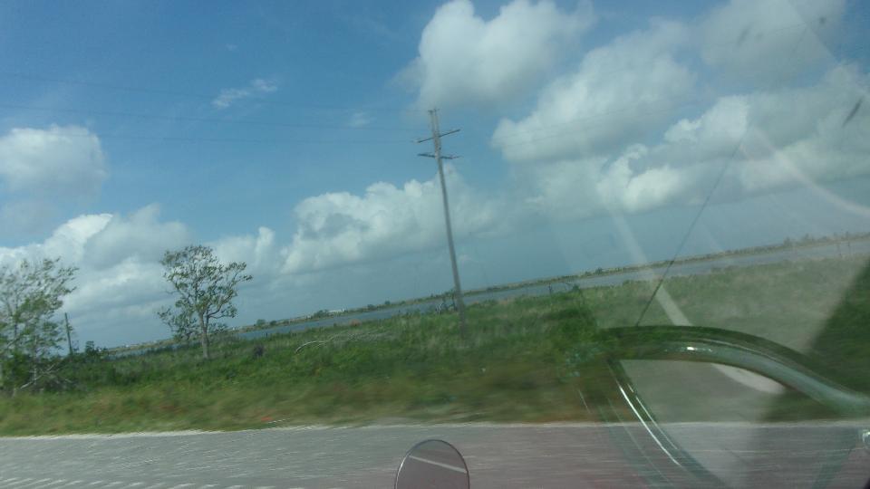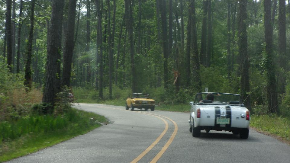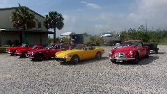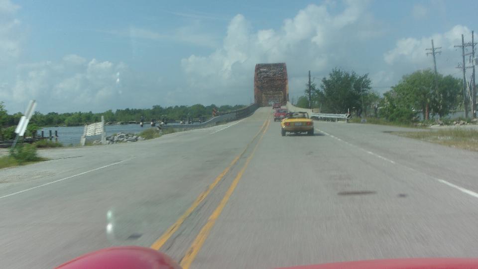 Then a smaller group of 7 cars was off for a run heading east, sticking to the side roads, along the north shore of Lake Pontchartrain, through Slidell, around the east end of the big lake here the white MG Midget dropped out (at home I think). Then west on US-90 crossing a couple of bridges along Lake St Catherine for a short rest stop.