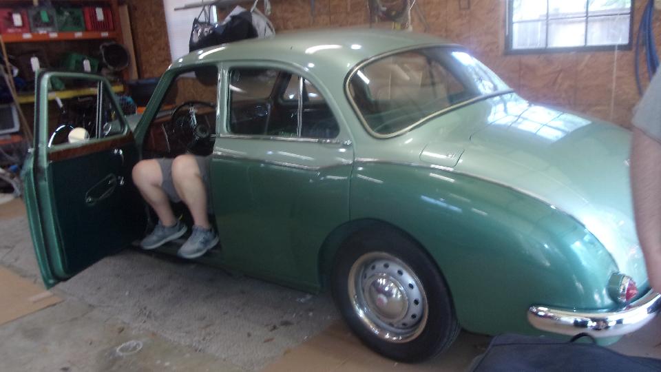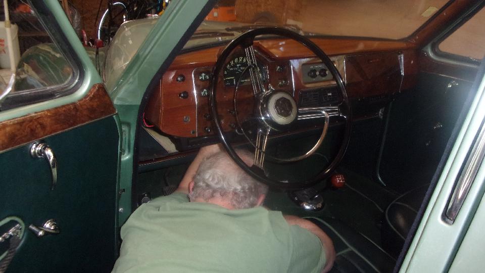Then we had a late morning appointment, heading back to Cliff Hughes' place in Mandeville. It bugged me that his speedometer didn't work when I was driving his Magnette last week, so we should do something about that. After some fiddling around we managed to disconnect the speedometer drive cable from back of dash and drop it down for access. Then jack up the rear wheel and run the car in place for a bit to verify the cable was not turning. Then just grab the cable center wire and pull it out. The piece that came out was only about 18 inches long before the break point, so there's the problem.