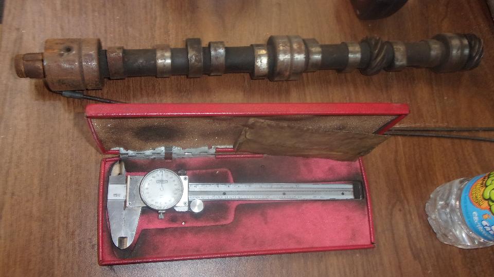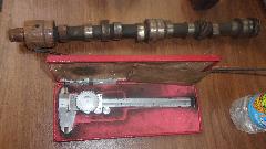 Then we got to chatting about air filters and crankcase ventilation and camshaft wear, and Cliff pulled a used camshaft off the shelf. So I pulled out my dia caliper and began measuring cam lobe base circle diameters and lobe height to see of there was a common pattern of wear on this used cam, and there was (just enough to measure). As predicted, 3 out of 4 of the cam lobes on front half of the cam had some measurable wear, while the four rear lobes measured close to new cam dimensions. It is an interesting phenomenon that may be related to crankcase ventilation and some ingested road dirt.