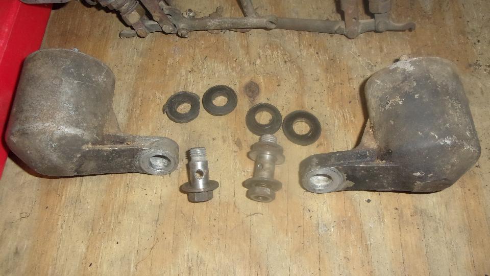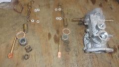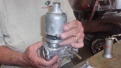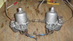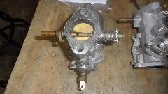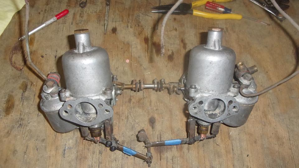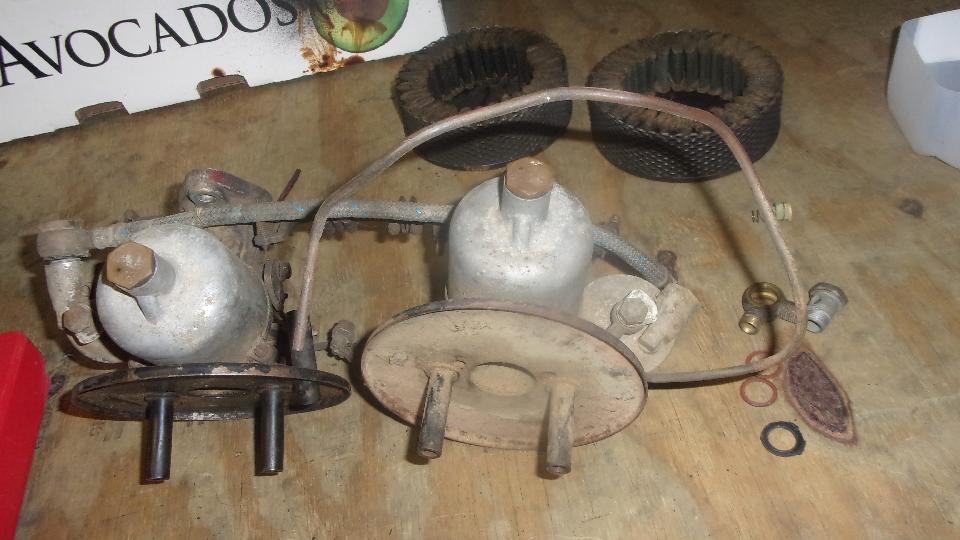 Aside from being dirty, these carburetors are actually in pretty good condition (except for choke arms having badly worn pivot holes). One surprise was that one carb had 1500 type banjo bolt holding the float chamber, while the other carb had 1600 type banjo stud with a nut on it. That prompted me to check the model number tags, which were both AUC943. That is the correct model number for MGA 1600 carburetors, 1600=AUC943 Carburetor Installation (1 pair). Then we checked the number on both of the fuel metering needles, also correct for the 1600 engine, both #6.