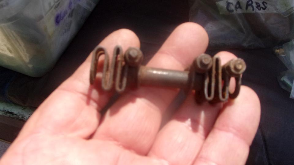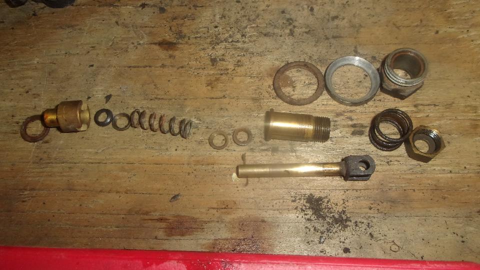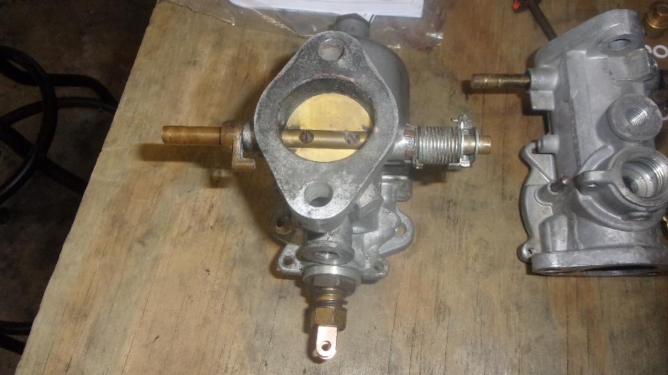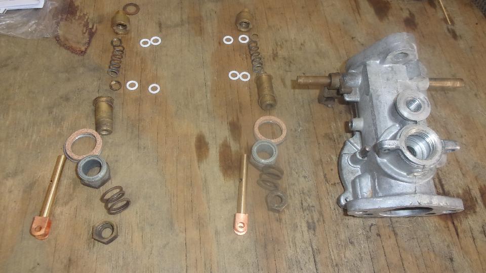 Got it down pat by that time, so not long to throw the second carburetor together. Install those nice brass choke arms, and assure that lifting the arms will operate the fast idle cam, followed by pulling the fuel jet down for fuel enrichment. When releasing the arm the tension spring must pull the fuel jet back up to seat firmly against the adjusting nut. Blue tape ins a reminder that some of the pivot holes in the arms are badly worn, so Steve will need to procure and install new brass arms.