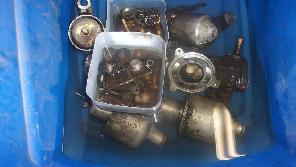 That leaves the question, how did one carburetor end up with the wrong banjo bolt? Just one of life's little mysteries, but I think we can set that straight during reassembly. By evening the carbs were completely disassembled (except for the throttle shafts), and we had them soaking in parts cleaner fluid.