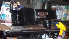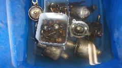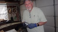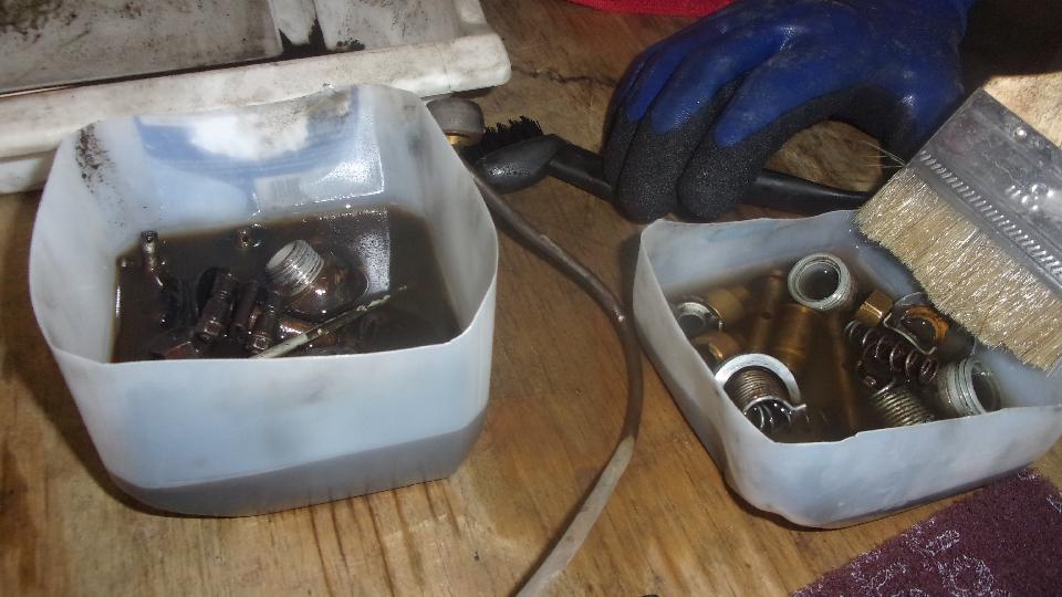 Early afternoon start again with Steve Schwieger's carburetors, and he's anxious to get going. Parts were soaking in parts cleaning fluid overnight, and Steve was already started on final brush cleaning and rinsing with lacquer thinner. After second rinse, drain and clean the pans, and pile the parts on the bench for sorting.