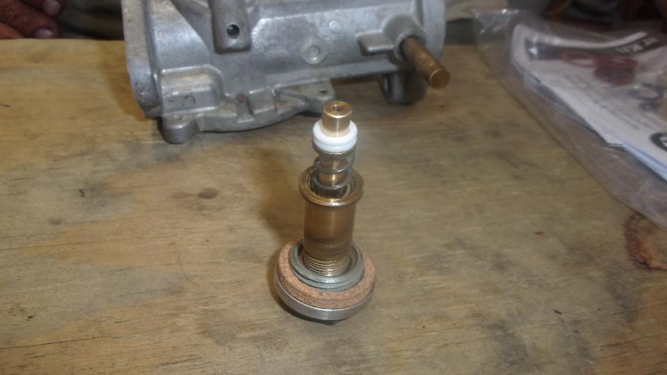 Not a show car, so not to bother with polishing and plating, but it is nice to work with clean parts. Throttle bodies and throttle shafts were in good condition, so not going to bush the housings or replace shafts this time. Starting with the main jet assembly, find all the little pieces and lay them out in order. New fuel jet tubes, gaskets and seal washers from the Master Rebuild kit. Teflon O-rings (McMaster-Carr source) and Viton grommets for the float chamber mounts came from the Magic Trailer. Stand the jet on end, and drop on the large gland nut with cork seal, lower jet bearing with thin copper seal washer. Push in two Teflon O-rings and a backing washer, followed by compression spring, another backing washer and two more o-rings.