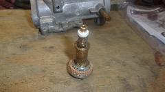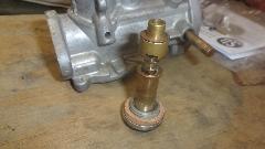 Set the upper jet bearing on top with another thin seal washer. Poke it all into the bottom of the throttle body, compress the spring and screw it together finger tight. Install the air piston with metering needle, light compression spring sitting on a thin brass thrust washer, and the dashpot cover. Screw the cover down tight, but notice the mixture adjusting nut and friction spring are not installed underneath yet. Remove top damper plunger, and drop a long thin screwdriver in the top to push the piston down. This will push the jet slightly downward to assure you that the jet top end is in intimate contact with bottom of the piston. This is the largest diameter part f the tapered needle, which in turn centers the jet and bearing assembly. Then tighten the gland nut until everything underneath is pushed tightly together so the jet bearings cannot move.