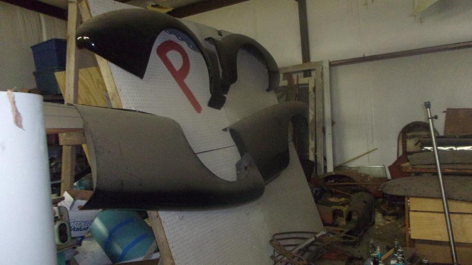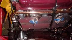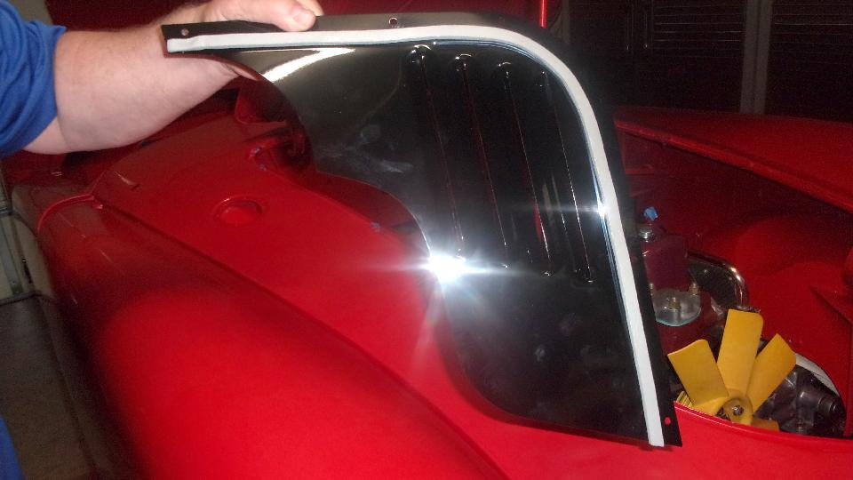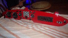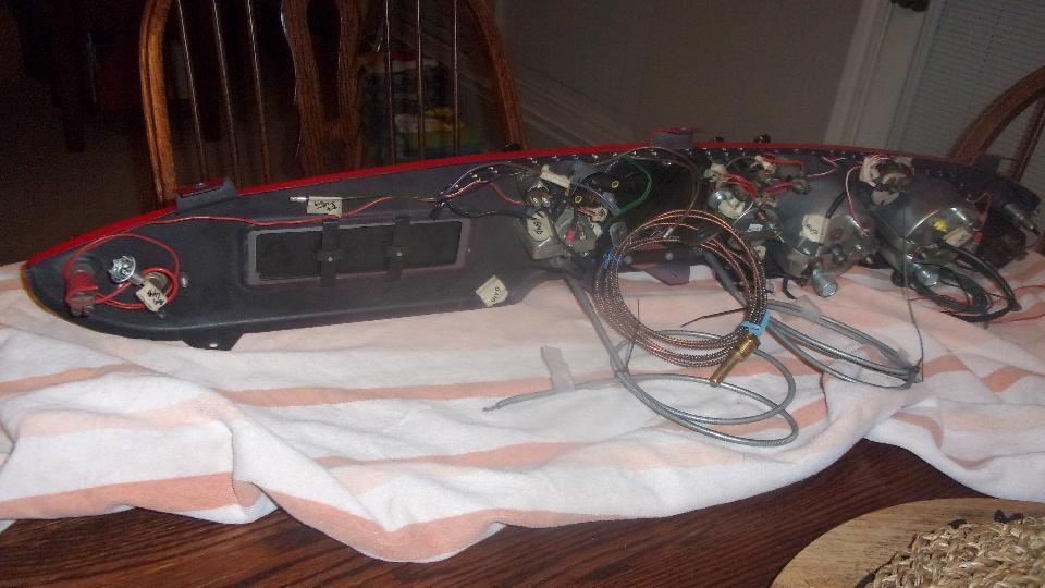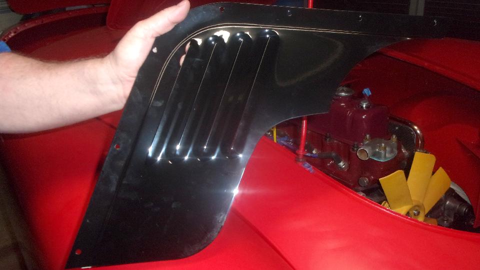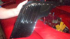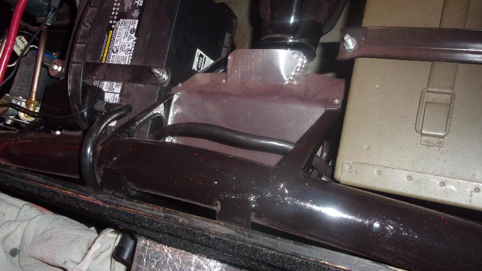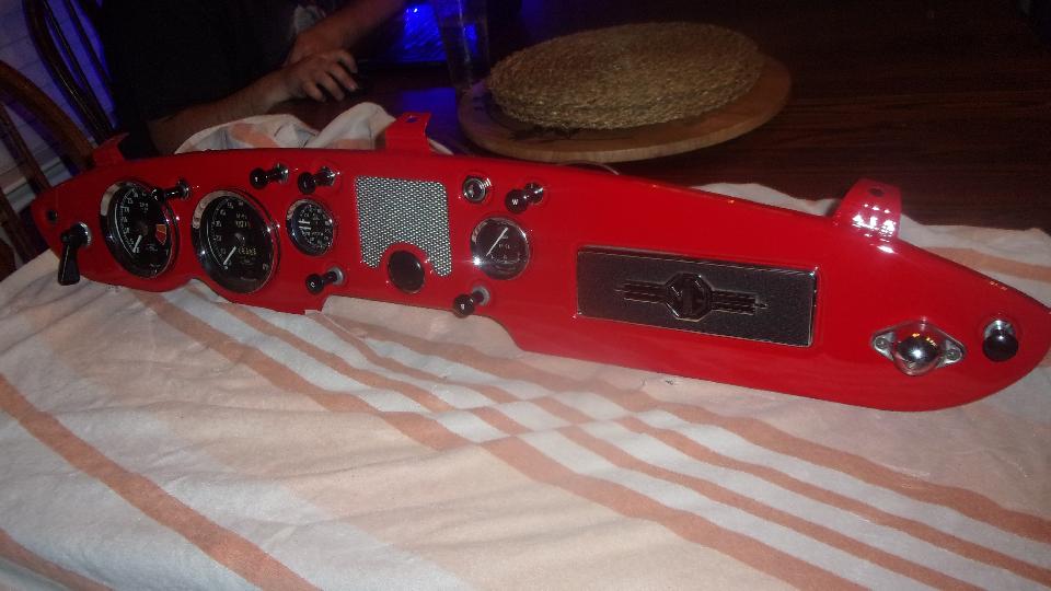 Andy was keen to show off a special "oil guard shield" that is intended to prevent oil or grease thrown off from the propshaft from getting under the battery cover. Seems like overkill, but hey, the car is a family member. Also what looks like an ammo case for storage in the second battery tray when running a single 12-volt battery in the right side tray. And the completely assemble dash board ready for installation.