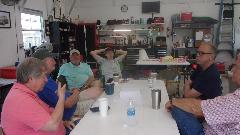 After traditional coffee and donuts, and these boys do like to chat about the cars and tools, I was summoned again to tune the carbs on this 1971 MGB with HIF carburetors. It ran fairly well on the road, but wouldn't idle for crap. Took a while to get it fairly decent, but it didn't want to idle slower than about 1200 rpm. Then the guy finally admitted that it has a fast road cam, and the regular misfire at lower idle speed may have something to do with low compression on one cylinder. Gimme a break, could have saved half the time if I knew that first. Everyone hauling out, so we were last to leave. Got a nice picture of the new shop building though.