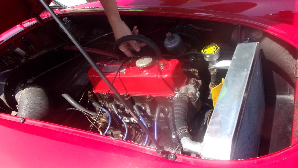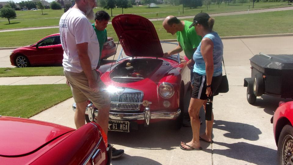 There were a couple local friends dropping buy, including a nice MGA needing a pinch of carburetor tune-up. the primary problem here was a broken screw for the throttle connection accordion clamp. Fortunately the Magic Trailer had the needed part, so that was soon fixed, along with carburetor adjustments.
