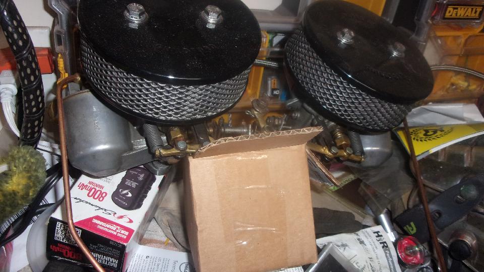 Float chambers installed with banjo bolts and new Viton rubber packing grommets. Floats and float covers in place with new gaskets, overflow-vent pipes, inlet filter screens with springs, and fuel inlet banjo bolts and seal washers. Throttle center shaft and flex clamps installed along with the top damper plungers. Still needing a new cross-over fuel hose and replacement brass choke arms. Good day's work. Time for dinner.