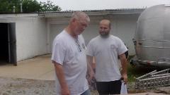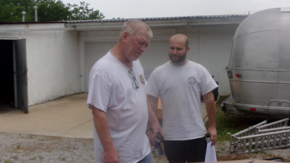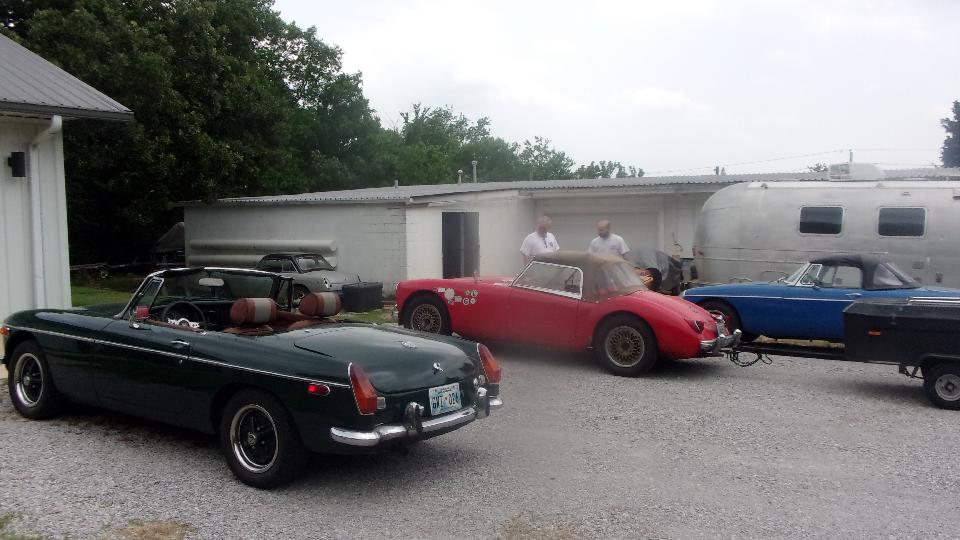 One more phone call and we were off to visit Michael Jones Restoration in Tulsa, OK. So there's Michael on the left with his protege Ian Fritz on the right, who is destined to be the new shop owner within a year or so. I believe the BRG MGB is Michael's daily driver car, while the blue one is Ian's daily driver. The shop is in the back hiding behind the Airstream trailer, and Michael's race car is in the box trailer.