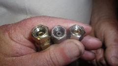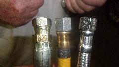 gauge pipe to the engine. The one in center is an original braided hose, perfect in every way. The one on right is a new Moss Motors issue hose with the female threaded end fittings that only screw on about two turns and may strip the threads before being fully secure (rats). The one on left is a new hose put together by a local hose shop on special order, perfectly functional, not exactly original appearance, and less expensive than the faulty Moss part.