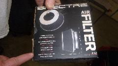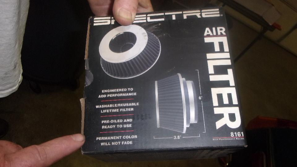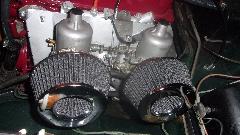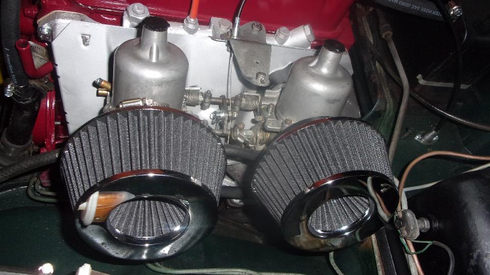 Next up is a nice set of conical air filters. They come with a spacer ring adapting them to clamp nicely onto the MGB standard issue shortie air horns. A twist of a screwdriver is all that's needed to R&R these filters, very handy. they are Spectre 8161 filters, procured from a local O-Reilly Auto Parts store (or other parts stores that can special order almost anything). They will not clear the brake booster on a late model rubber bumper MGB.