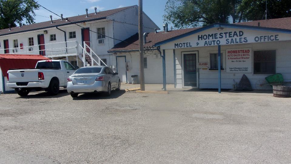 Being Monday (ignoring the legal holiday), we wandered back to Junction City, KS to take another shot for a visit at Homestead Auto Sales (minimal activity), and Motel (old and slow), and Tow Service (over loaded), and repair shop (maybe anything other than vintage British cars). Things looked to be closed up, but a phone call raised a friendly voice, and when I mentioned our mutual friends in Panama City, Florida had sent us, the guy popped right out to say hello (and check out the car of course).