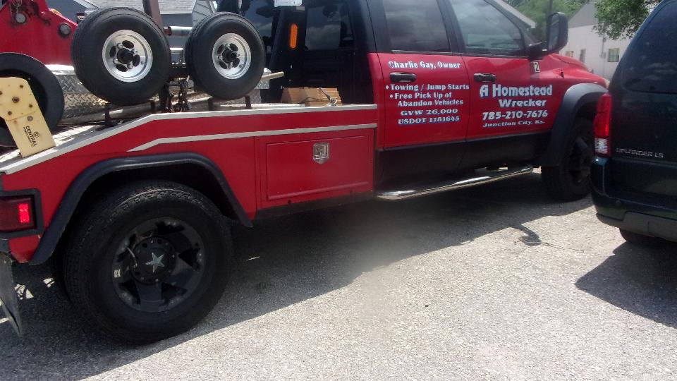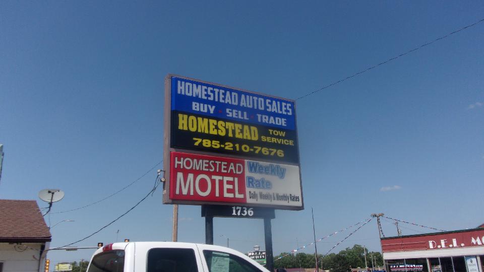 Nothing else scheduled today, so we drove 50 miles to Junction City, Kansas go visit the place. On arrival the whole place was locked up, including the motel office. Called the same number again and was told this is not the right place, or not the right number, even though the number is painted clearly on the present sign. So I called the number on the tow truck, "Cant get to the phone, leave a message", but the voice mailbox was full. Heck of a way to run a business. Yes, there is a service shop back there too. Looks like we will have to come back for another visit during business hours on Monday.