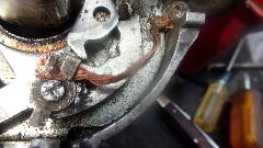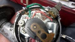 Already cleaned the points, and they test good open and closed. Plenty tired of this crap, and still hopelessly puzzled over what seems to be impossible. Time to call the distributor bewitched and pull the spare Lucas distributor out of the trailer to swap the bottom end, everything below the cap. Of course it was seized tight in the mechanical advance parts, so on with the penetrating oil and tools to get it disassembled and oiled up working and reassembled. Pretty sure the vacuum advance diaphragm leaks, but can fix that later after we get the spark to be more reliable. Some fuss with the power input flex wire with this one, but eventually back together and running again. We drove 30 miles to our next appointment without incident, but still reserving judgement to see what happens next.