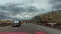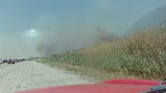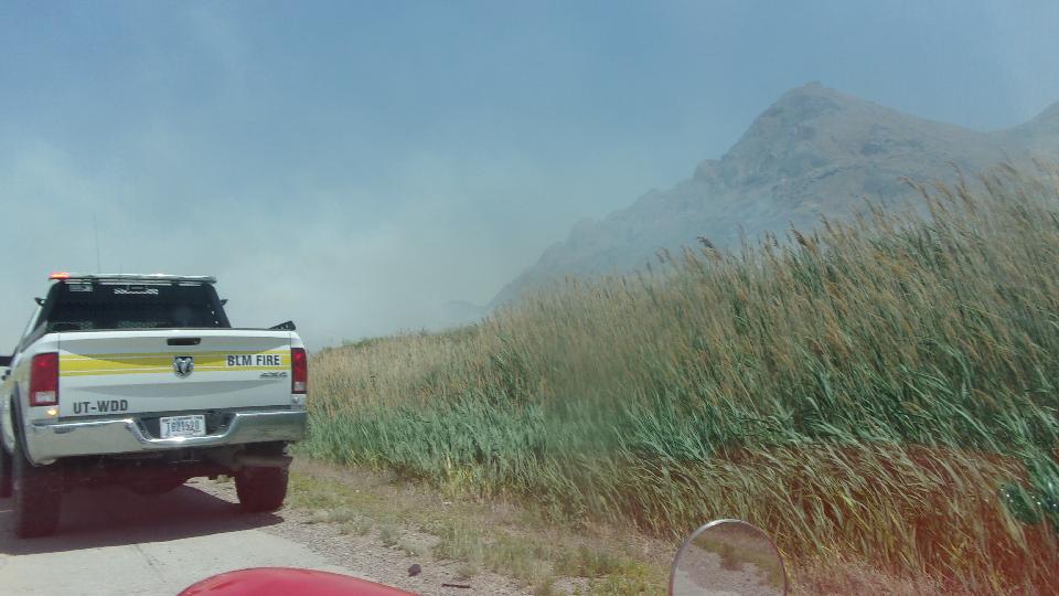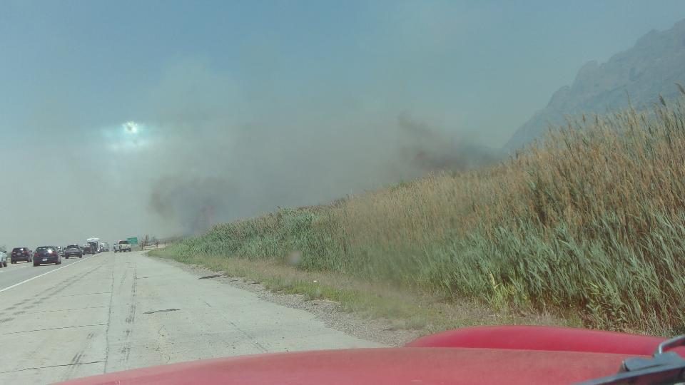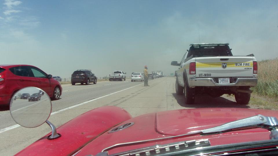 Get out of the city, 20 miles west to Lake Point, UT, and we thought we were fixed for the day. Then there was a power outage about lunch time, and we had to leave. Local traffic lights were out, so a bit of struggle to get onto I-80 going back east, and we immediately ran into stop and creep traffic thanks to a grass fire in the mountains, likely the cause of the local power outage. After a while the combination of stop and creep and loose fan belt finally pegged the temperature gauge, so it seemed prudent to pull over and shut it off. Unfortunately smoke all around and fire licking at the roadside near ahead. We got a break when a fire worker truck stopped to inquire, and after a bit we got an escort up the shoulder of the road for the last 3/4-mile to the next exit ramp.