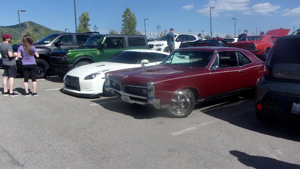 Bit of a hodgepodge parking, but some of the similar models like to park together. I would too, if there were any similar, but not much today. Mostly newer (modern) cars, but there were a few vintage cars, if you look hard enough. These days it depends on what you call "vintage". While I think pre-1981 analog cars with carburetors, other folks might think anything before turn of the century is now vintage. I found a 1964 Pontiac GTO 6-pack. The owner said it had a '65 rally dash when he bought it, and had to change it back to the proper '64 dash. But then hey, there was another GTO, a hardtop this time. It peaked my interest because I knew someone who bought one of these new while I was still in high school.