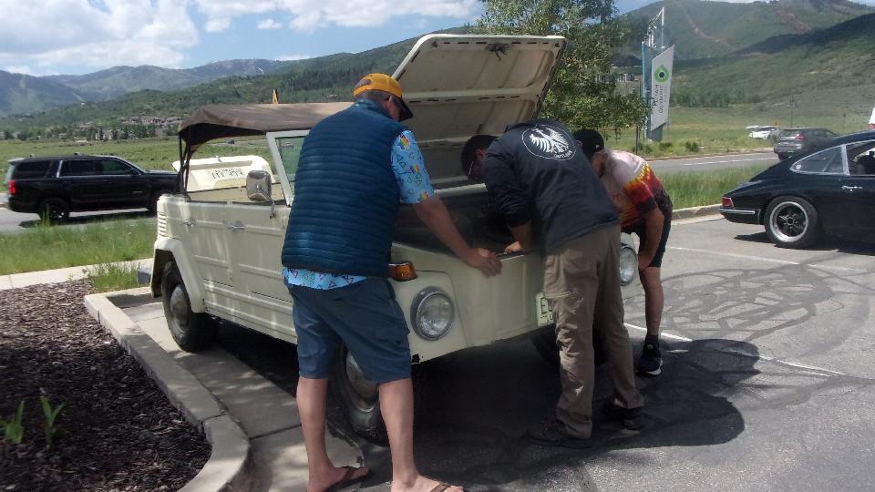 About half past 10-pm I casually asked navigator where our morning Cars And Coffee appointment was supposed to be, and he said, 27 miles (and 2500 feet more elevation) back up the hill in Park City where we passed through on Thursday. If we were going to have to run up that hill, we better install the alternator brackets first, so we did.