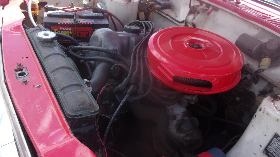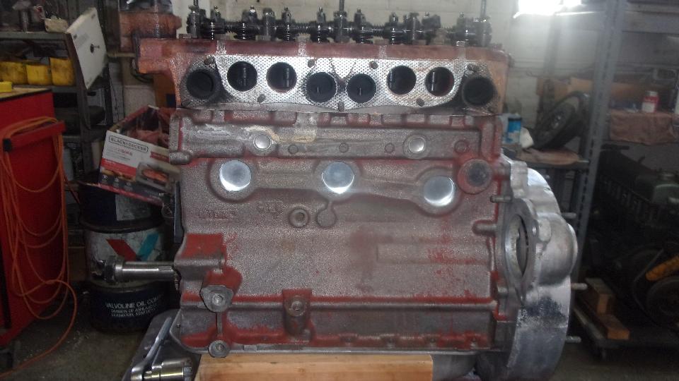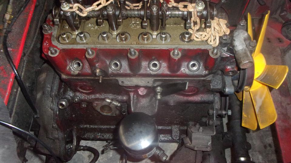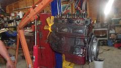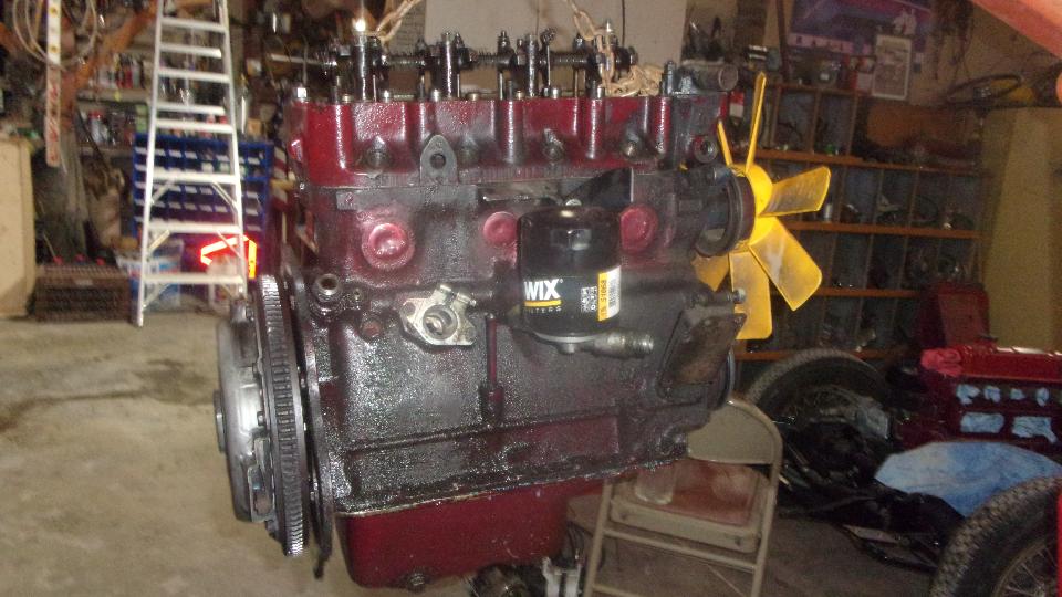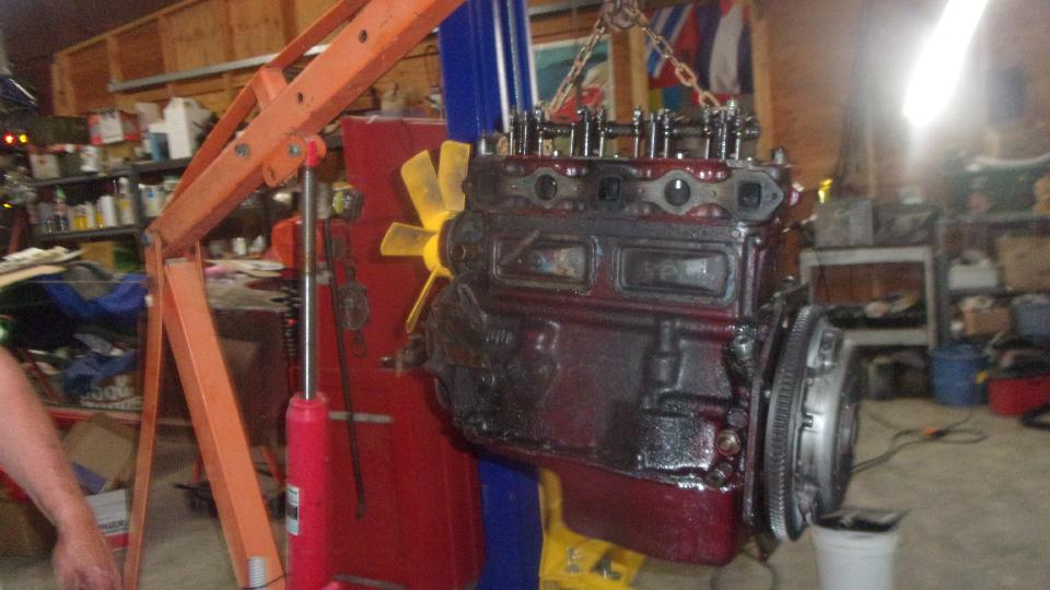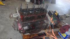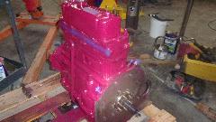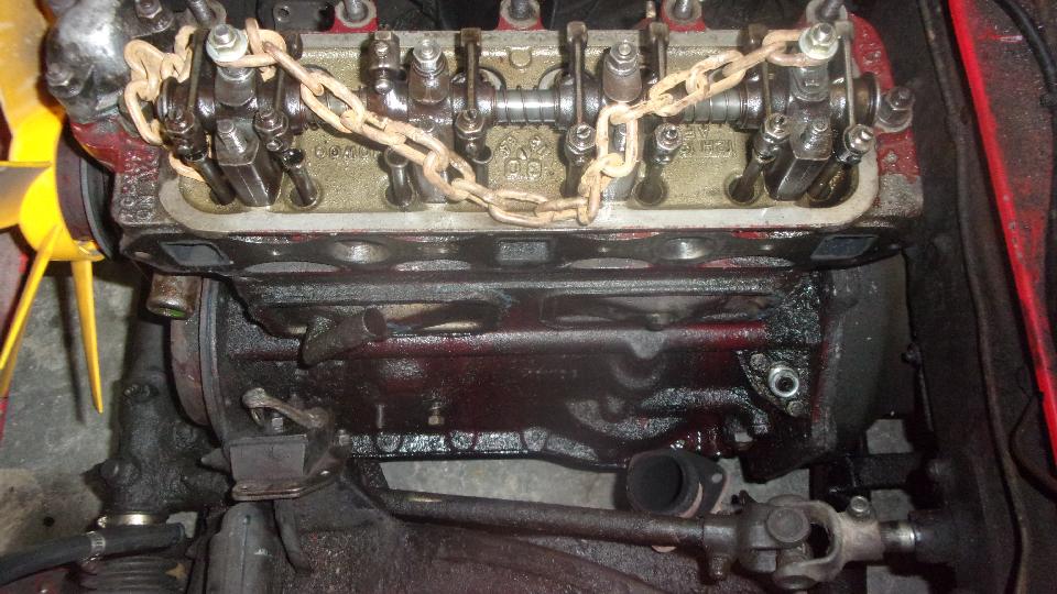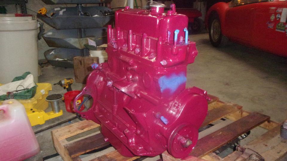 We spent a lot of time cleaning the engine before paint, upright, laying on left side then right side. Swabbed it sown with petrol to remove dirt and oil, then rinsed with lacquer thinner to remove dirty petrol (and flash dry). Painted 80% of the oil sump while lying on one side, then the rest of the sump when upright, and then on to the rest of the engine. Before you ask, the color is Rustoleum Cranberry. Yes it does look a bit purple and pink when wet, but it appeared to be fading darker as it dries, so maybe it's not too far off from the original dark red. Will have another look at it by daylight tomorrow.