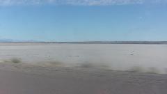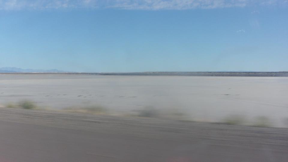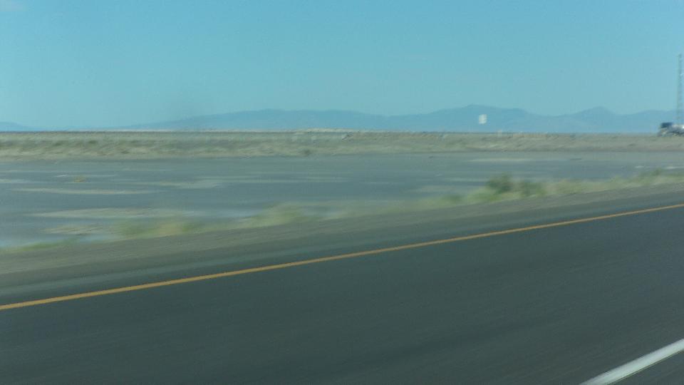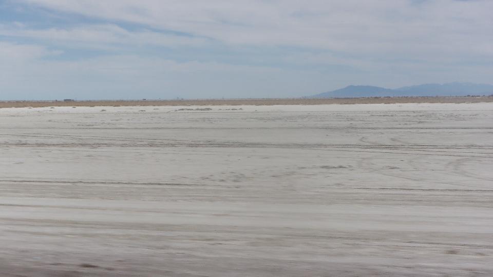 This was hard to see last night in the dark, but this morning we have a blur of salt on the right side and water on the left side. Think ankle deep water, and when it evaporates it leaves the salt, to remind us where we are. Apparently some 4-wheelers like to test this stuff driving off the road. Sometimes they make a short crescent of ruts and get immediately back on the road. Sometimes they make a half crescent of ruts, get stuck and have to be towed out. That must be an embarrassing misjudgement. The important sign is, Exit 4 Bonneville Speedway, west edge of Utah off of I-80. We are passing it by this morning, but may come back later. Certainly too early in the year for racing (rainy season), have to wait for the salt to dry out.