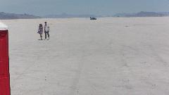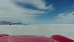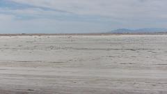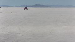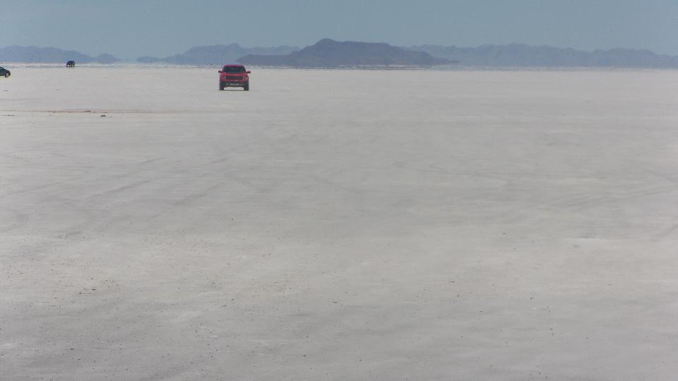 First picture looking northeast, bit of a zoom-in close up, as that car is about a quarter mile away. Notice the rocky knoll (mountain) in the upper right, we are going to pan that way. With a truck coming in we are looking straight at that mountain. Then we took the car out there, and pan a little more to the right, now looking to the right of the mountain (more like east by north-east). In that direction we are looking straight down the Bonneville Speedway track. Imagine 16 miles of straight and flat where you can see the curvature of the earth on a clear day. We took more pictures, but they all look pretty much the same. Until they paint the black guide line on the surface, you will likely be snow blind and lost out there (and it must be worse returning into the afternoon sun).