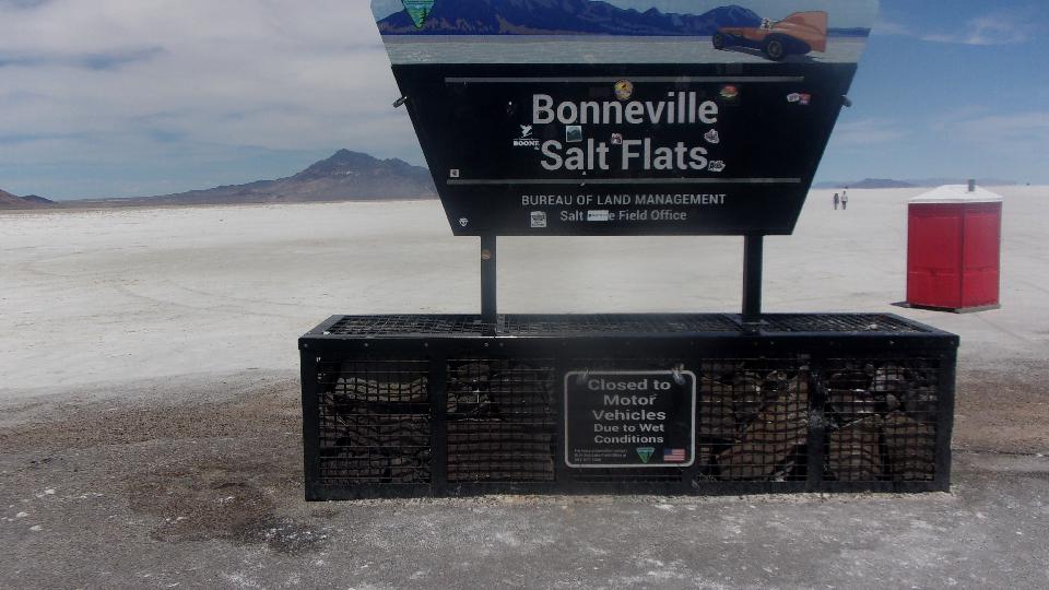 The slightly rutted and rough salt is on the north side of the road (both sides actually), as vehicles must play there sometimes, and it never gets graded. At end of the road, the official Salt Flats marker. Closed due to wet conditions? Not too wet today, at least not nearby, as there were a few vehicles playing in the salt.