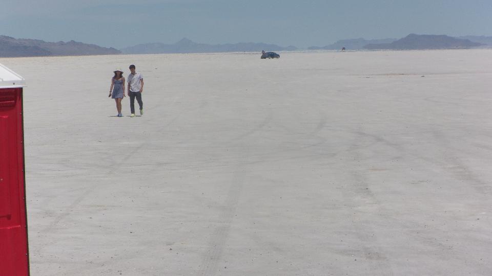 There is a small parking area at end of road, maybe more like a launching platform a foot above the salt. I suppose the idea it that when it floods the roadway drains first to so not to leave much salt on the road when it dries (just a guess). For sure when there are hundreds of vehicles here during Speed Week, they ain't parked on the pavement.