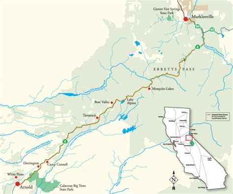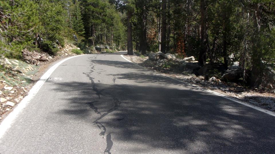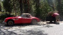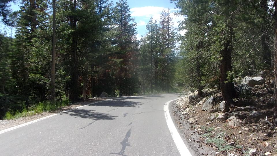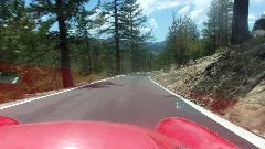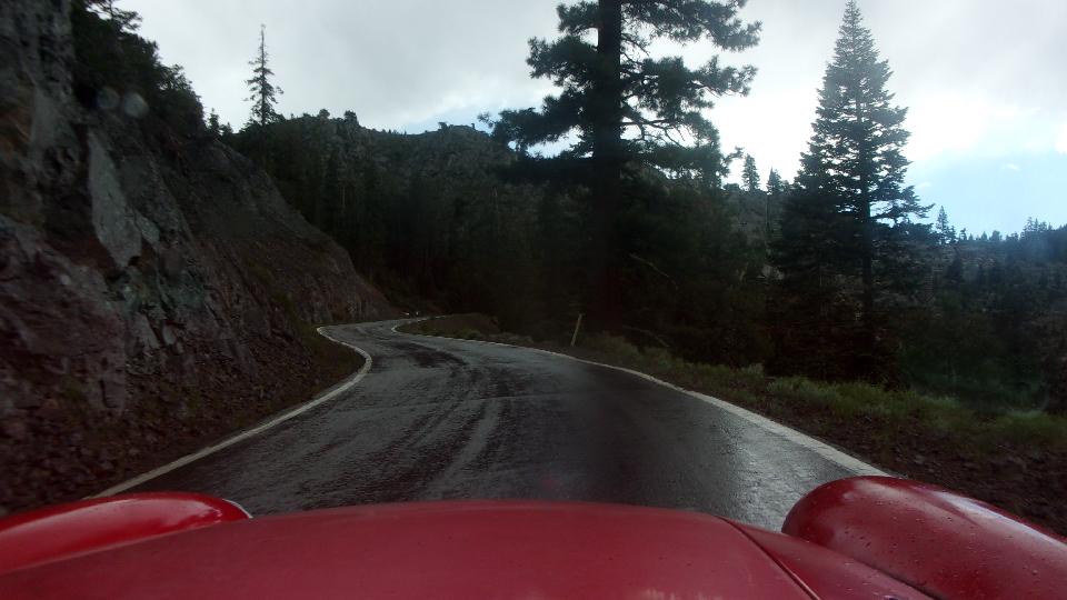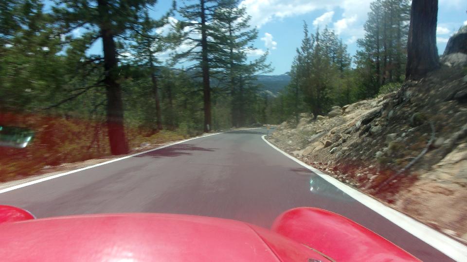 Up early, finally found a "friendly" WiFi spot for breakfast, and stayed for lunch before heading out again after 1-pm. Going to be a challenging drive today, supposed to do 83 miles that should take 2 hours, winding our way down and up and over Ebbett's Pass in the Sierra Nevada Mountains in NE California. Very steep and winding roads with lots of tight switchbacks, makes Tail of the Dragon look like child's play. Much of it is very narrow asphalt with two white lines, no center line, because it isn't wide enough for two lanes. And the bicycle club was out in force (damn). Meet an oncoming car when you come up on a bicycle, and you're just screwed. Time it right, and maybe we can maintain 5-mph up a very steep hill in 1st gear to pass a bike. Been this way before, but not with so many bikes in the road. Engine was running rich, and with low compression, and wanted to foul a spark plug (or two) at low speed, so try to keep it over 2500 rpm with throttle on when possible.