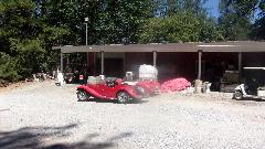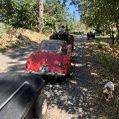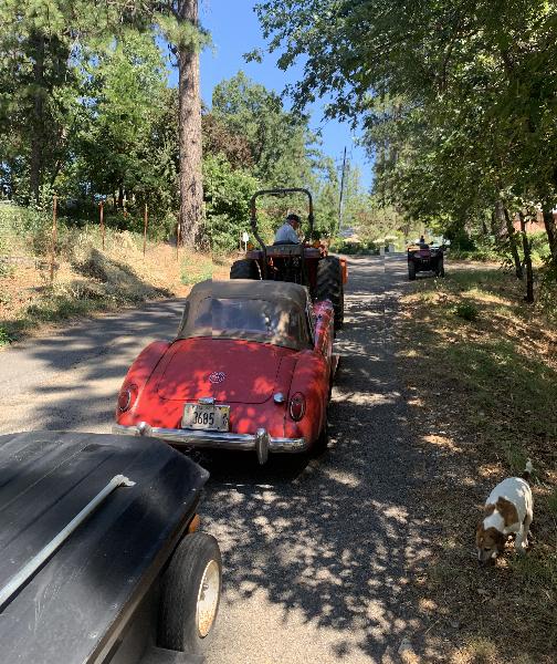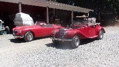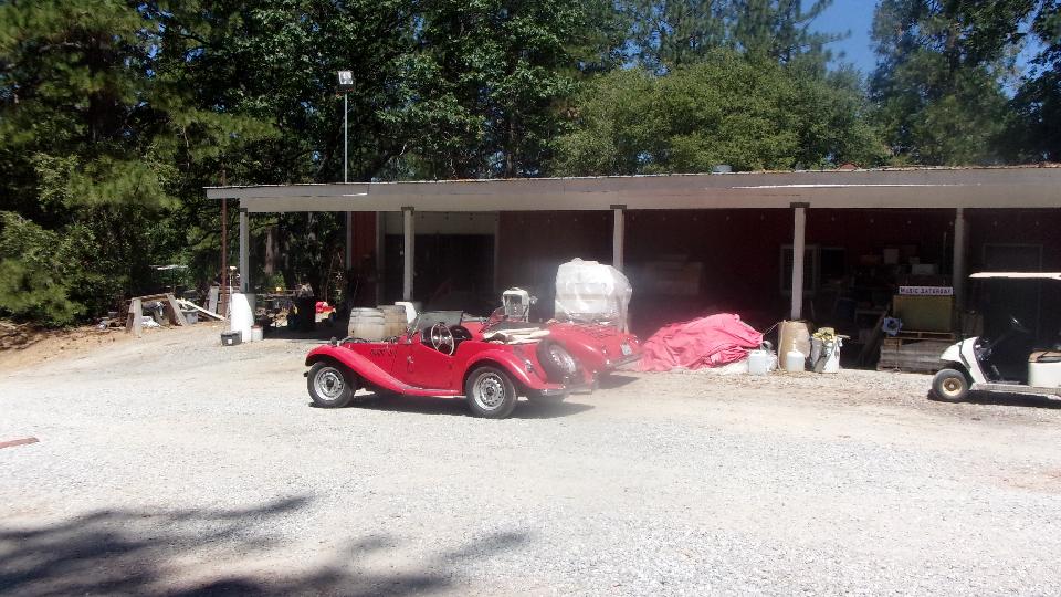 Still descending from Ebbetts Pass, left the lodge and rolled us down the hill another 7 miles, mostly in neutral with engine idling using some brakes to keep coasting speed down. Destination was a visit with our old friend Stuart Mast at Brice Station Winery north of Murphys, CA. We knew what was coming, a very steep and fairly long upgrade driveway, so we hit it flat to the floor in 1st gear, but it was fouling out and running in 2 cylinders, so we didn't make it up. It's okay, I can take a little embarrassment while getting towed up the hill to the workshop. We were in good company. The MGA and MG TF are long term residents here (regular driver cars). Didn't take long to get my MGA tucked into the shop and cooling down.