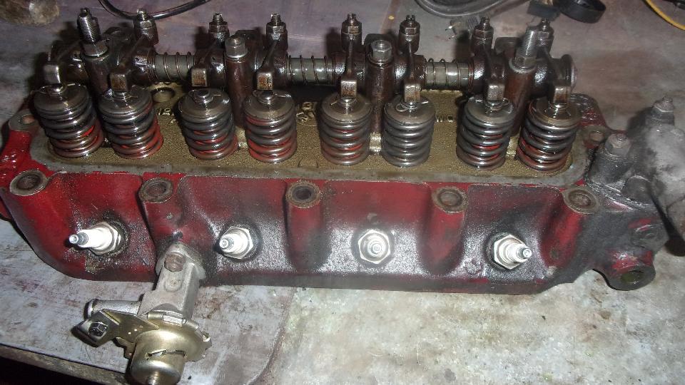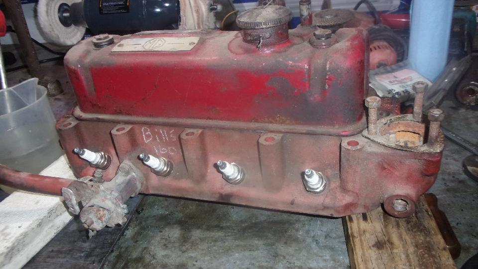 As so happens, Stuart has a spare 1600 engine, since he is in process of installing an 1800 in his current MGA project car. Story on this 1600 is it was rebuilt some time ago (many years past), and has not much miles on it, but has been sitting unused for many years. Looked at the cylinder head first, all valves sitting slightly proud of the combustion chamber ceiling, but a couple of them leaking slightly, which should be easy enough to fix.